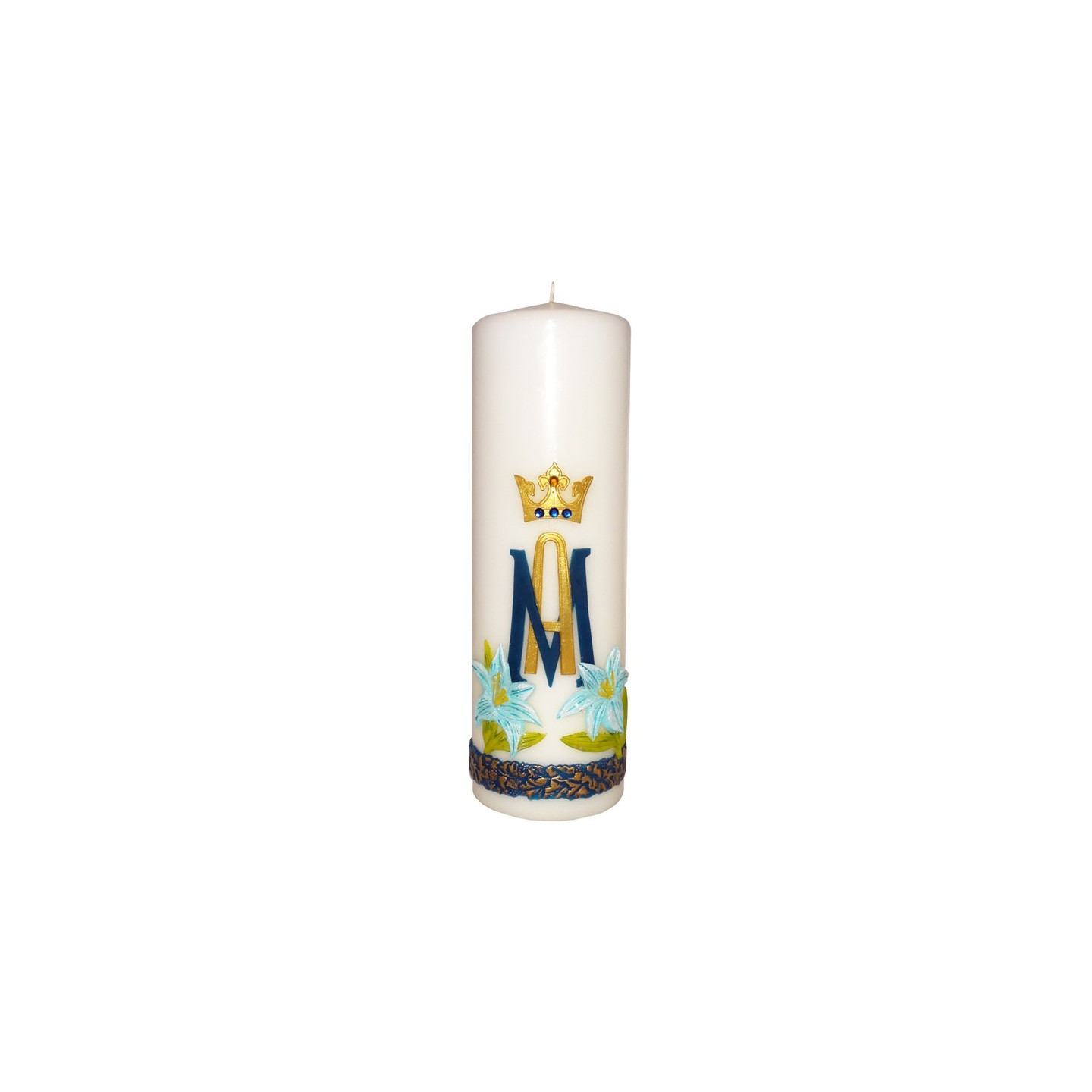 Masa [kg] - 2.0 kg Wysokość [mm] - 300 mm średnica [mm] - 100 mm Ilość szt w opakowaniu - pakowana jednostkowo Świeca wykonywana w kolorach białym i ecru. Zdobiona aplikacją woskową.