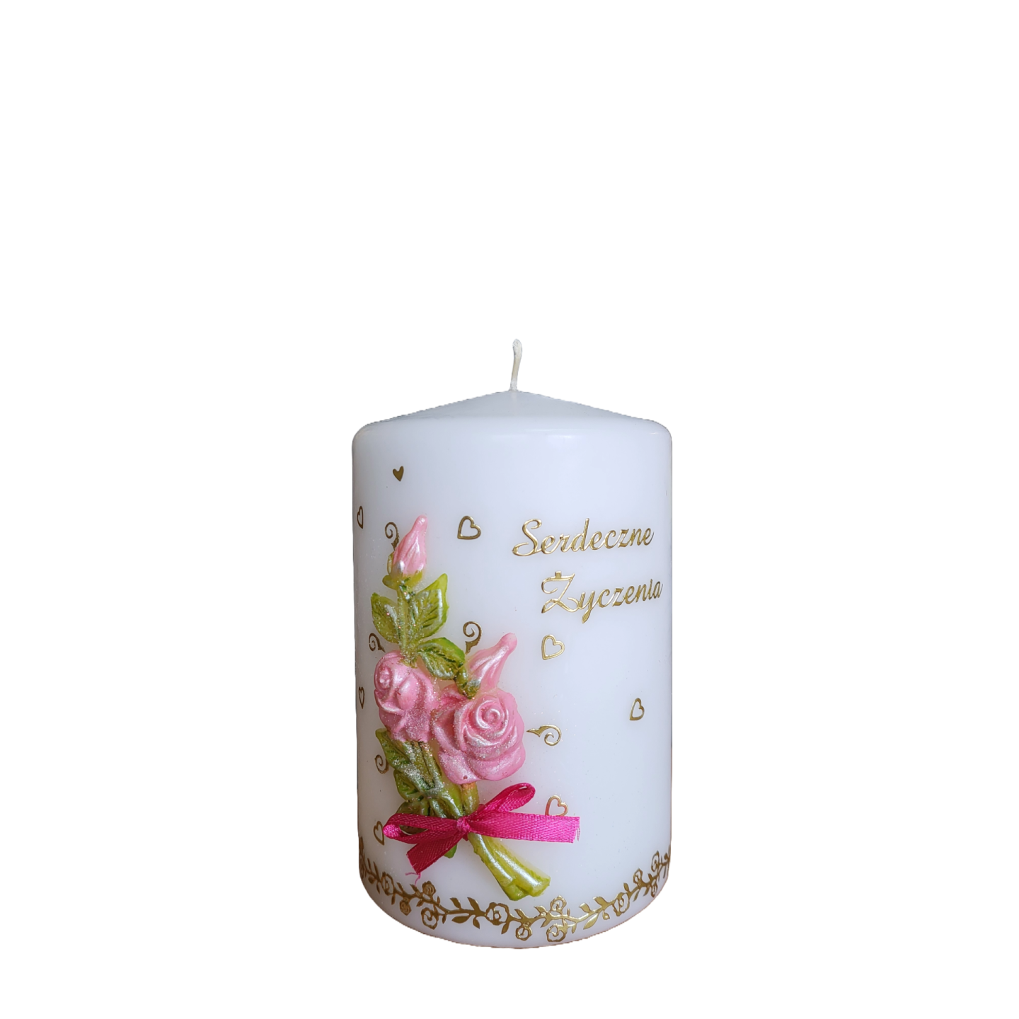 Świeca wykonywana w kolorach białym i ecru. Zdobiona aplikacją woskową.