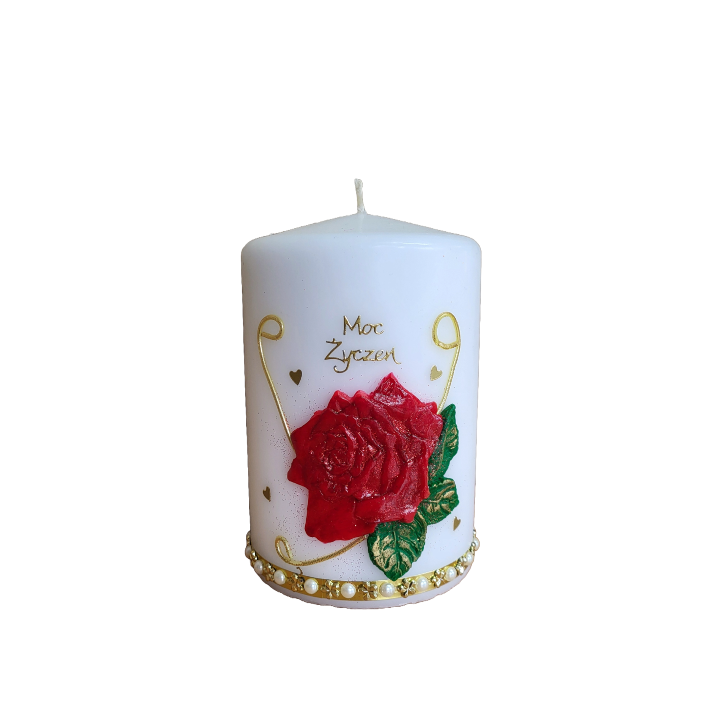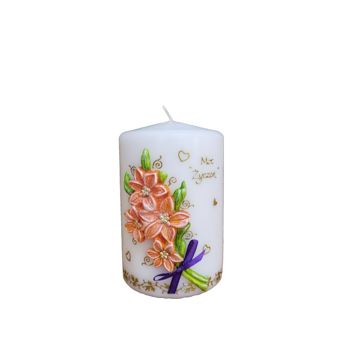 Świeca wykonywana w kolorach białym i ecru. Zdobiona aplikacją woskową.