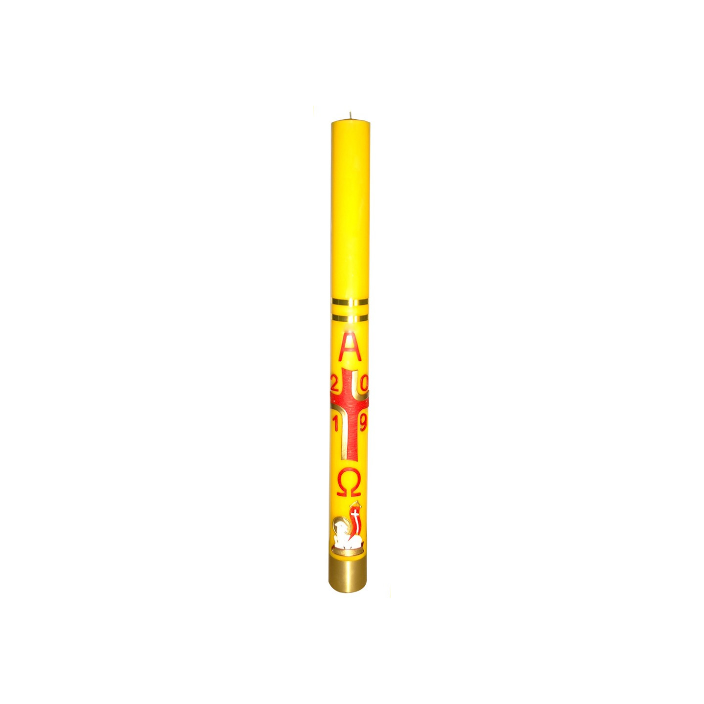 Świeca pakowana jednostkowo. Opakowanie zawiera komplet gron(ziaren, gruszek), a na krzyżu jest nawierconych 5 otworów do ich umieszczenia. Paschał udekorowany jest wypukłymi aplikacjami woskowymi. Dolna opaska jest tuleją mosiężną zwiększającą wytrzymałość mechaniczną jak i nadającą klasyczny wygląd tradycyjnej Świecy Paschalnej. Świeca produkowana jest w kolorze białym, żółtym i woskowym(z dodatkiem naturalnego wosku pszczelego)