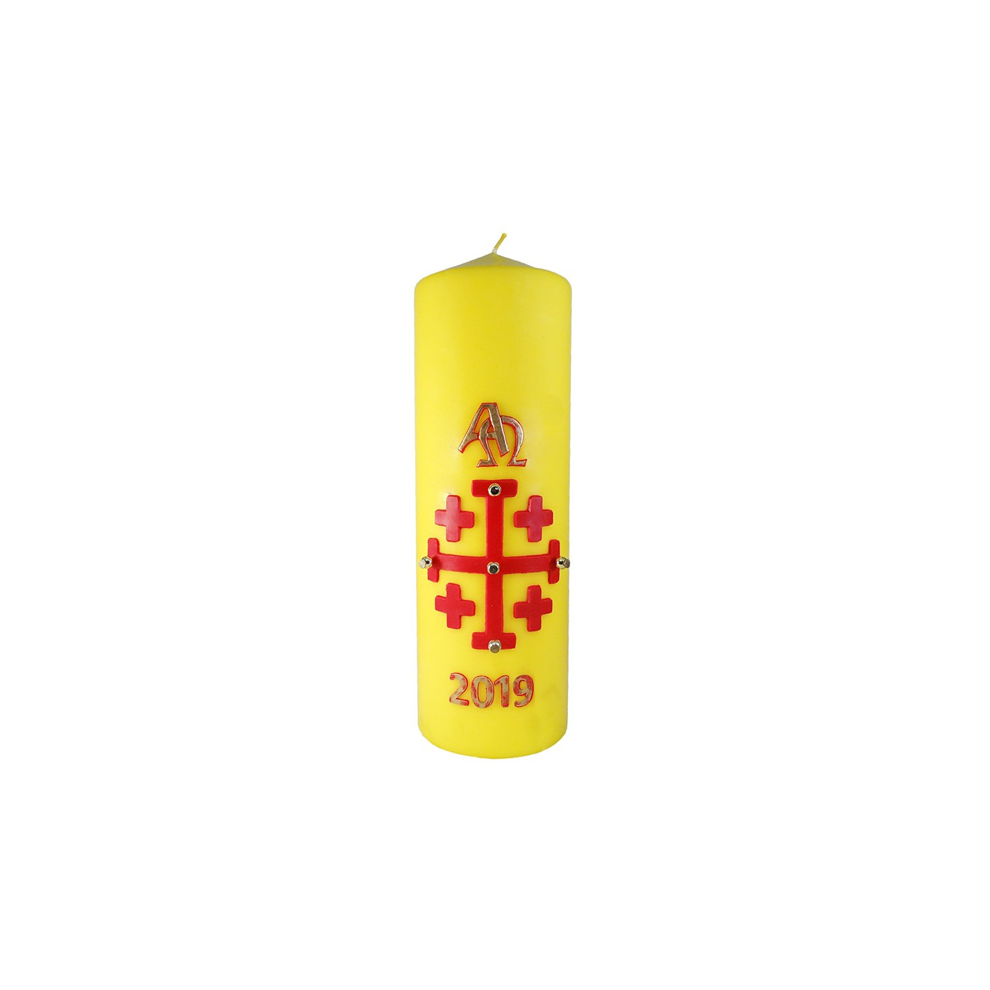 Masa [kg] - 2,00 kgWysokość [mm] - 300 mmŚrednica [mm] - 100 mmIlość szt w opakowaniu - 1 sztŚwieca produkowana jest w kolorze białym i żółtym. Świeca dekorowana jest wypukłymi aplikacjami woskowymi.
